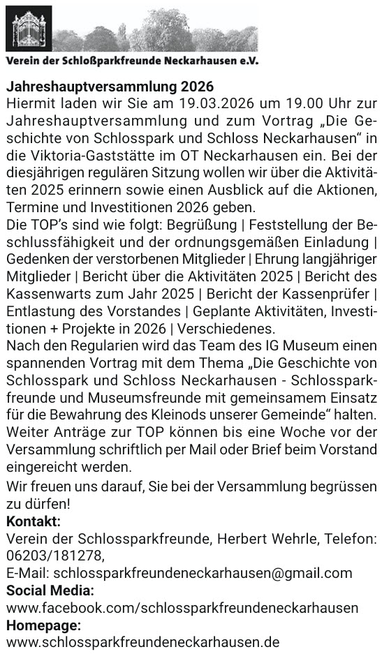 Pressespiegel IG MuseumAmtliches MitteilungsblattSchlagwörter:2026AMBMitgliederversammlungSchlossparkfreunde NeckarhausenVortrag