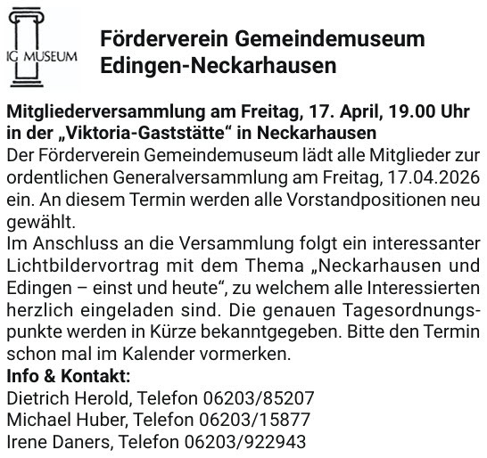 Mitgliederversammlung am Freitag, 17. April, 19.00 Uhr in der „Viktoria-Gaststätte“ in Neckarhausen [AMB]